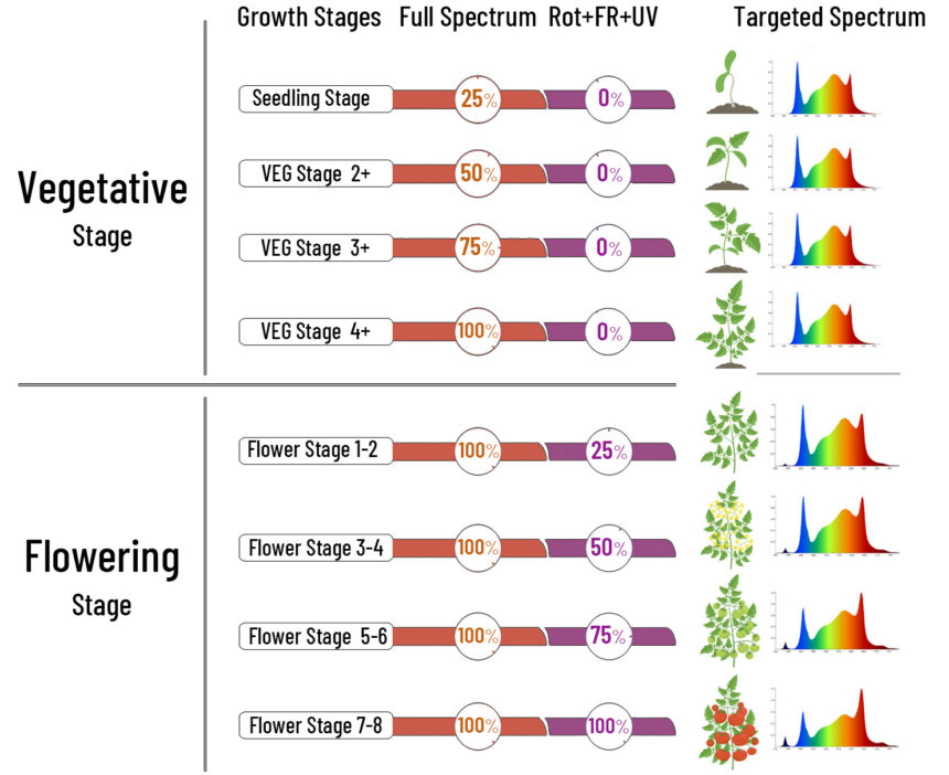 2. When flowering stage starts, grower/s can adjust the light intensity of “Red+IR+UV” channel, there will be more red light to speed up the growth, and bigger and high quality yield will come soon!